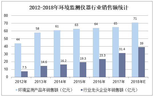 據(jù)統(tǒng)計(jì),2012-2017年中國(guó)環(huán)境監(jiān)測(cè)儀器行業(yè)銷售額穩(wěn)定增長(zhǎng),2017年銷售額為65億元,預(yù)計(jì)2018年銷售額為71億元。預(yù)計(jì)2018年龍頭企業(yè)銷售額在39億元左右。